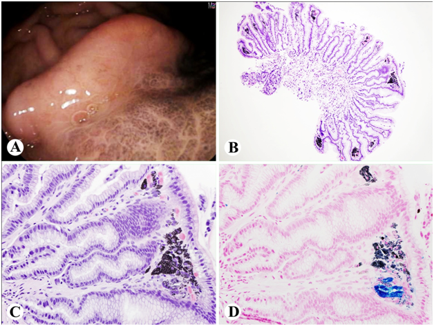 Histologically, the gastric biopsy revealed characteristic subepithelial pigment deposition. Aggregates of subepithelial macrophages with coarse brown-black pigment were seen within the lamina propria (Figure 1B-1C). This pigment had focal and patchy positive staining for iron (Figure 1D). These changes were consistent with pseduomelanosis.