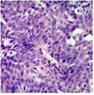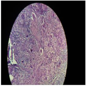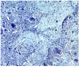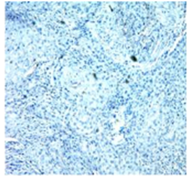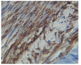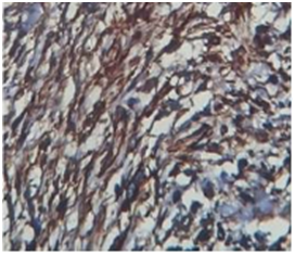 In present study out of 6cases, one case of Sclerosing Rhabdomyosarcoma was noted involving Head and Neck region (tongue), in 50years old male patient. Immunohistochemistry was done which shows strong positivity for Vimentin, weakly positivity for Desmin and 40% tumor cells positivity for Myogenin (Figure 8, Figure 9, Figure 10 & Figure 11). SRMS is an unusual variant of RMS that was first described in 2000 by Mentzel et al.42 They described three cases of RMS in adult patients, characterized by prominent hyaline sclerosis and a pseudo vascular growth pattern, and termed sclerosing, pseudo vascular rhabdomyosarcoma. In 2002, Folpe et al.43 also described four cases of an unusual hyalinizing, matrix-rich variant of RMS. They named it as sclerosing rhabdomyosarcoma.43 However, so far, there was still less than 40reported cases (the present case is not included) in English literatures.44–48 According to Julie. among the 39reported cases, SRMS can arise in a broad age ranged from 0.3 to 79years with an average age at 27. The most commonly involved sites (including the present case) are the extremities (19/40) and head and neck (16/40).48 Histological, SRMS has a characteristic constellation of features and is characterized by hyalinized, eosinophilic to basophilic matrix.49 Immunohistochemically, SRMS is usually strongly positive for Vimentin, Desmin and MyoD1, and weakly, focally positive for Moygenin suggesting its skeletal muscle differentiation, but negative for CK, S-100, CD34, and CD31.42,43,46,47