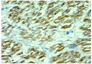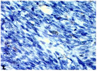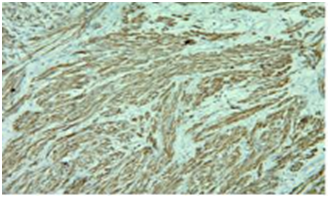 Gutierrez G et al.26 reported incidence of 1.1% of Dermatofibrosarcoma protruberance of all the soft tissue sarcomas and 0.06% of all malignant tumors.50 In the present study they constituted about 3.4% of all the soft tissue sarcomas. Gutierrez G et al.26 reported a male predominance accounting to 36%. Males are more frequently affected as reported by Enzinger FM & Weiss SW. In the present study a Female patient was involved. In a review of 853 cases at AFIP 1960-79 the site distribution was noted to be 14.5% in head and neck, 47.4% in trunk, 18.2% in upper extremities, and 19.9% in lower extremities. In the present study 1 case was noted in the lower extremity, which shows CD34 positivity. Only 1 case of Leiomyosarcomas was encountered in our study, constituting an incidence 3.4% of soft tissue sarcoma. The Location of tumor was Paratesticular region, a rare site in 71years old male patient. Immunohistochemistry shows strong positivity for SMA and Desmin, Moderately positivity for EMA and Vimentin and negative for S100 and Myogenin (Figures 12-14).