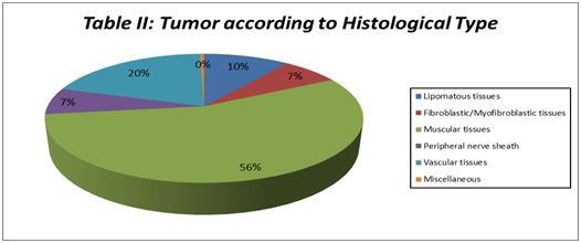 In Male common benign tumor was Haemangioma followed by lipoma, Fibroma, Nevus and schwannoma while common malignant tumor was Fibrosarcoma followed by malignant fibrous histiocytoma, Rhabdomyosarcoma and Liposarcoma. In Table 4, as per the locations, Benign soft tissue tumors are commonly located in pelvis and Retroperitoneal sites (58.8%), among which uterus was the most common site, followed in decending order by Head and neck region (22.5%), Upper limb, Lower limb, Chest and Abdomen and Back region. Common site for Schwanomma and Neurofibroma, Giant cell tumor, Glomus tumor was Head and Neck and Upper limb respectively.