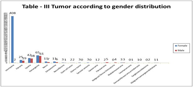 The soft tissue tumors were classified based on WHO classification”. The relevant data’s were collected and recorded such as Age, Sex, Location of tumor and a final diagnosis were given with gross and microscopic characteristics. A total of 5895 cases were collected, out of which total 794 cases were noted to be a soft tissue tumors. In Table 1, Among 794 positive sample, 61 cases found to be malignant and rest cases was benign in nature. According to Table 2, the histological type, the most common type was found to be from Muscular tissues i.e 442 cases(55.7%), followed by vascular tissues i.e. 157 cases(19.8%) and Lipomatous tissues i.e 83 cases(10.4%).Incidence of Fibroblastic/My fibroblastic and Peripheral nerve sheath types were found to be almost equal. tumors have been mentioned. Soft tissue tumors were commonly seen in female gender (79.0%). Lipoma and hemangioma are most commonly seen in both genders. In the Table 3, some common types of benign and malignant soft tissue In Female most common benign tumor was leiomyoma followed by hemangioma, lipoma, fibroma, Nevus, schwanomma and neurofibroma while common malignant tumors was Rhabdomyosarcoma followed by synovial sarcoma.