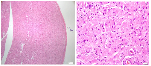 Figure 1 & 2 circumscribed encapsulated lesion composed of round to polygonal to spindle shaped cells with eosinophilic granular cytoplasm and centrally placed small nuclei.