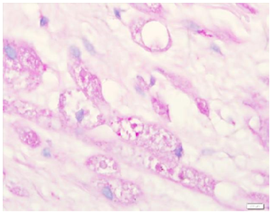 Figure 8 PAS Stain showing positive intracytoplasmic granules.