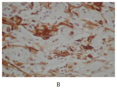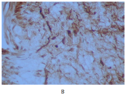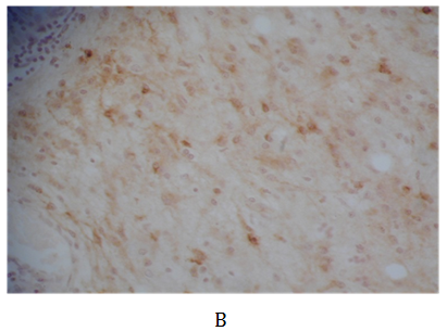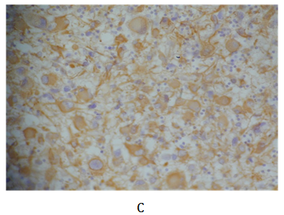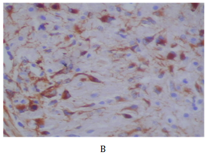 Nestin staining was seen in all astrocytic tumors. Pilocytic astrocytomas show mostly focal and weak staining with strong staining of Rosenthal fibers (Figure 3). Grade II astrocytoma shows weak but more intense staining than pilocytic astrocytoma (Figure 4). The strongest staining was in glioblastomas multiforme (GBM) and in Anaplastic astrocytomas (Figure 5,6).