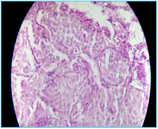 A 13-year-old girl presented with a left sided abdominal swelling and vague abdominal pain for 3 months, initially having clinical suspicion of an ovarian tumor. There are no other significant findings. Her family history and past history was unremarkable. No palpable lymphadenopathy of supraclavicular, cervical, and inguinal region were detected. She was normotensive. Her total blood count was within normal limit, except low hemoglobin level. Biochemical investigations for urea, creatinine, and RBS showed normal physiological values. Liver function tests and Chest X-ray were normal. Ultrasonography revealed a well-defined heterogenous isoechoic SOL in the splenorenal region. CT scan revealed a homogenously enhancing lobulated pancreatic SOL arising from the distal body and tail in the gastro-splenic space exerting pressure effect in the nearby organs. After exploratory laparotomy, spleen preserving distal pancreatectomy with appendicectomy was done under GA and resected sample was sent for histopathological examination (HPE). On gross examination, the tumor was well-circumscribed, round with glistening surface reddish-brown in color measuring 10 cm × 8 cm.