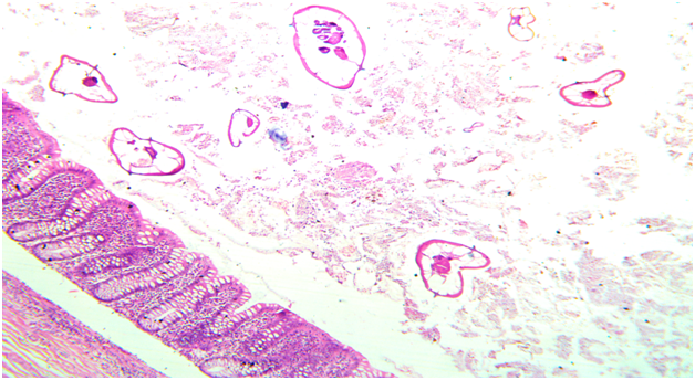 Figure 1 Microscopic photo showing mucosa of appendix with lumen showing multiple enterobious vermicularis parasite. (HE, X10)
