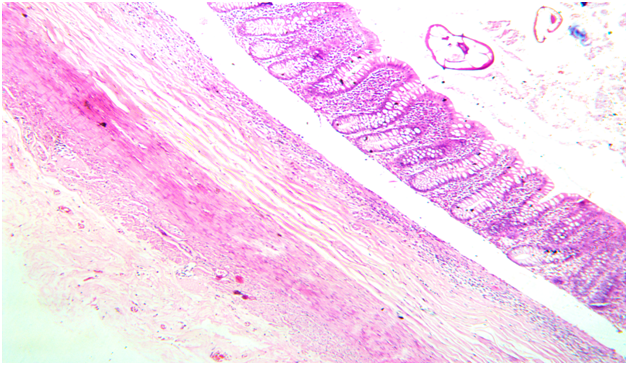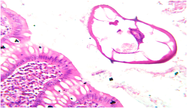 A 22 year old male patient came to the casualty department with pain in abdomen. On physical examination there was right iliac fossa tenderness. A laboratory investigation revealed a normal Complete Blood Count (CBC). Serum immunoglobulins levels were not done in this patient as clinicians did not suspect parasitic infection as a cause of acute appendicitis.Ultrasonography was performed and did not show inflammation of appendix or any other abdominal organ. Clinical diagnosis of acute appendicitis with unkown etiology was made and patient underwent open appendicectomy. The specimen was sent for histopathological examination to know the exact cause of appendicitis. On gross examination appendix appeared normal with presence of fecolith. Microscopic examination revealed mucosa with inflammatory infiltrate predominantly comprising of eosinophils which is most commonly seen in parasitic infection and lumen showed parasite of Enterobius Vermicularis (Figure 1&2). The rest of the layer submucosa, muscle layer and serosa appeared normal and showed no evidence of neutrophilic infiltrate or congested blood vessels which is usually is seen in acute appendicitis without parasitic infection. (Figure 3). The diagnosis of acute appendicitis secondary to Enterobius Vermicularis infection was given. Post operatively a dose of mebendazole 100mg was given and patient is being followed up.