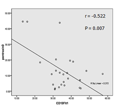 There was significant positive correlation between sflt-1 and pentraxin 3 (r = 0.398 & P-value = 0.049), neutrophil-flt-1 and monocyte-flt-1 (r = 0.552 & P-value = 0.004) (Figure 1), neutrophil-flt-1 and uric acid (r = 0.455 & P-value = 0.022) in group II. However, there was significant negative correlation between sflt-1 and monocyte-flt-1 (r = -0.551 & P-value = 0.009) (Figure 2), sflt-1 and neutrophil-flt-1 (r = -0.683 & P-value = < 0.001) (Figure 3), neutrophil-flt-1 and pentraxin 3 (r = -0.522 & P-value = 0.007) (Figure 4), pentraxin 3 and nitric oxide (r = -0.496 & P-value = 0.012) in group II (Figure 4). ROC curve analysis (Table 2) revealed that BMI at > 25 had an AUC of 0.82, sensitivity, specificity, PPV and NPV of 84, 52, 63.6 and 76.5 % respectively with P-value = < 0.001. Uric acid at > 6.0 had an AUC of 0.646, sensitivity, specificity, PPV and NPV of 8, 88, 40 and 48.9 % respectively with P-value = 0.077. A/C ratio at > 30, had an AUC of 0.784, sensitivity, specificity, PPV and NPV of 16, 92, 66.7 and 52.3 % respectively with P-value = 0.001. CCR at ≤ 40, had an AUC of 0.754, sensitivity, specificity, PPV and NPV of 20, 84, 55.6 and 51.2 % respectively with P-value = 0.002. AFP at > 8.5 ng/ml had an AUC of 0.674, sensitivity, specificity, PPV and NPV of 68, 60, 63 and 65.2 % respectively with P-value = 0.035. Soluble flt-1 at > 1986 pg/ml had an AUC of 0.941 (Figure 6), sensitivity, specificity, PPV and NPV of 84 % P-value = < 0.001. Monocyte-flt-1 at < 42.3 % had an AUC of 0.71, sensitivity, specificity, PPV and NPV of 76, 68, 70.4 and 73.9 % respectively with P-value = 0.011. Neutrophil-flt-1 < 41.3 % had an AUC of 0.874, sensitivity, specificity, PPV and NPV of 80, 84, 55.6 and 53.1 % respectively with P-value = < 0.001. Pentraxin 3 at > 5.9 ng/ml had an AUC of 0.82, sensitivity, specificity, PPV and NPV of 68, 72, 68 and 68 % respectively with P-value = 0.001. Nitric oxide at < 73.5 µmol/l had an AUC of 0.702, sensitivity, specificity, PPV and NPV of 64, 68, 66.7 and 65.4 % respectively with P-value = 0.014.