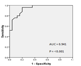 Data were analyzed by using SPSS (Statistical Package for Social Science) version 16. Results were expressed as mean±standard deviation (SD) unless otherwise specified. Student t-test of Mann Whitney was used to compare variables between studied groups. Pearson correlation was used to perform correlation between different variables. Results were considered significant if P-value was<0.05 and highly significant if P-value<0.001. Receiver Operating Characteristic (ROC) curve was used to estimate area under the curve (AUC) of different variables where 0.9-1.0 indicating an excellent test, 0.8-0.9 a good test, 0.7-0.8 a fair test and 0.6-0.7 a poor test. ROC curve was used to estimate the optimal cut-off value for best sensitivity and specificity of coordinate points of the curve. The optimal cut-off value was used to estimate both positive predictive value (PPV) and negative predictive value (NPV) of the studied variable.