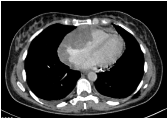 Figure 1A CT scan shows a mass at the pericardium extending into the right ventricular myocardium.