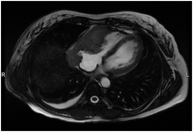 Figure 1B Cardiac MRI shows an infiltrating soft tissue mass involving the right atrium and right ventricle.