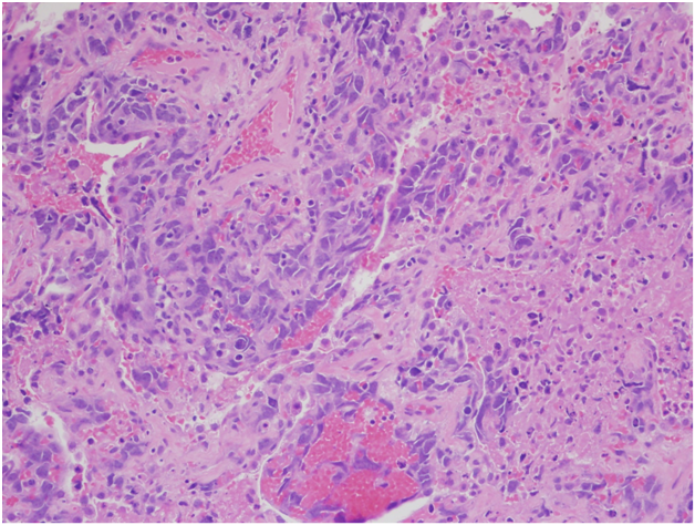 Intraoperatively and grossly, the tumor was noted to be markedly firm and dark red in color. Frozen section of tissue from a lung nodule in the right lower lobe showed a high-grade malignant neoplasm with large pleomorphic cells and frequent mitoses.