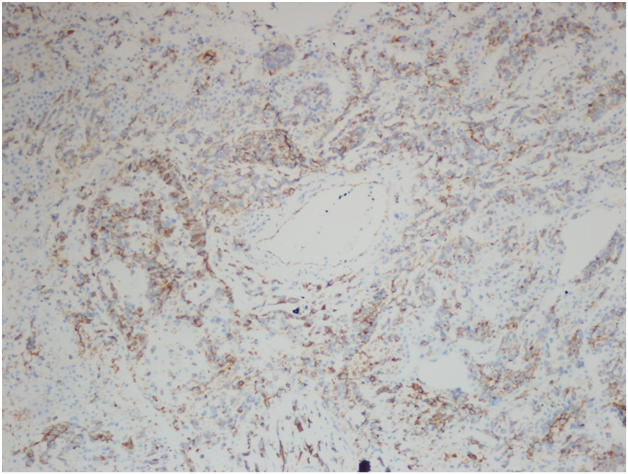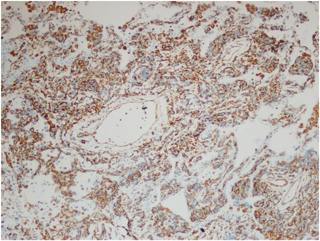Figure 3C Right lower lobe wedge resection. Immunohistochemical stain for vimentin, 400x.