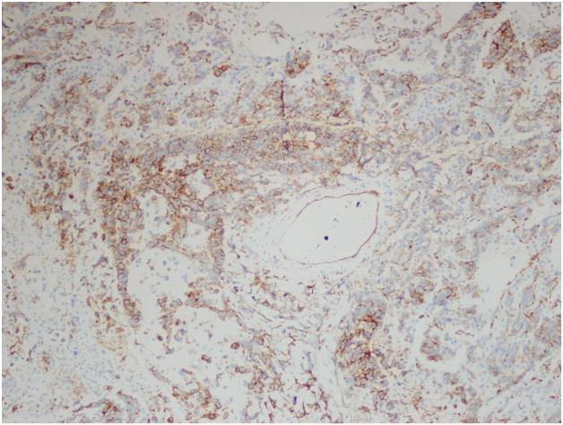 Figure 3D Right lower lobe wedge resection. Immunohistochemical stain for AE1/AE3, 400x.