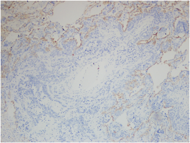 Figure 3B Right lower lobe wedge resection. Immunohistochemical stain for CD34, 400x.