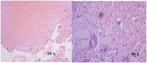 Figure 4 H&E Stained section show spaces separated by septa containing blood. Septa compose of osteoclast like giant cell and fibroblast (Aneurysmal bone cyst).