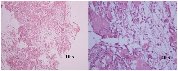 Figure 5 H&E Stained section show osteoclast like giant cells in cluster and mononuclear cells are loosely arranged and mainly in spindle shape (Giant cell reparative granuloma).
