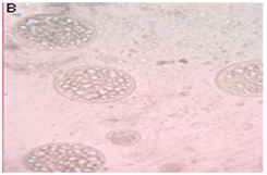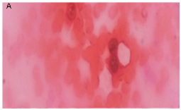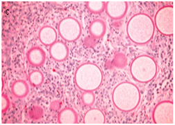 The patient underwent a left infraorbital mass excision with dacryocystectomy under General Anaesthesia. Care was taken to avoid spilling of spores during complete removal of the mass. Extension of growth in nasolacrimal duct was also removed en bloc along with the sac. The nasolacrimal duct wall was curetted after removal of growth. Specimen was sent for fungal studies (Figure 2) and histopathology. The histopathological report was suggestive of rhinosporidiosis (Figure 3). The patient was kept on daily 100mg oral diaminodiphenylsulfone (DDS) (Daps one) for 3 months and was instructed for regular follow up for detecting recurrence.