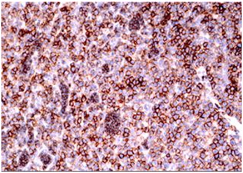 Figure 4Immunohistochemistry stain of CD138 showing diffuse cytoplasmic positivity, (40X).