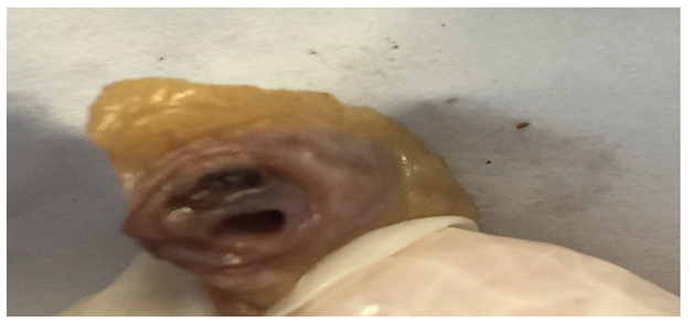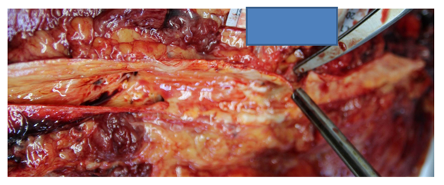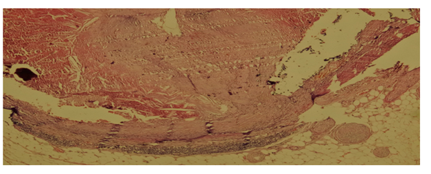 A 53 year old man complaining of headache was brought to emergency department but he was dead on arrival to hospital. The medical history gathered from family members was unremarkable except for a cerebrovascular accident four years ago. The autopsy had held in the Forensic Medicine Council of Adana Branch Morgue Department by two fellow forensic medicine specialists with the evaluation of a forensic pathologist and toxicologist. There were injection marks on left inguinal area and right antecubital fossa. Diffuse atheromatous plaques were seen in the aorta. There were numerous scar areas around the septum of the myocardium. There also was 1000 cc blood in the abdominal cavity escaped from the incomplete abdominal aortic rupture in the distal part with a false channel lumen between the intima and the media layer (Figure 1). Coronary dissection was noticed at right coronary artery and also a hematoma with a false channel lumen (Figure 2). Histopathologically, there were subadventitial dissection together with hematoma formation and luminal narrowing on the right coronary artery. The cause of death was given as co-effect of coronary artery dissection and aortic dissection (Figure 3).
