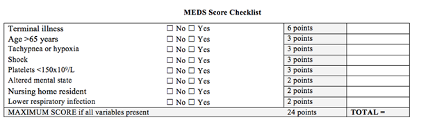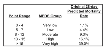 To illustrate a EWS, the scores used to determine a patient’s mortality rate using MEDS is shown below. Table 3 is the checklist used to determine the score and Table 4 shows the predicted mortality rate based on the score.