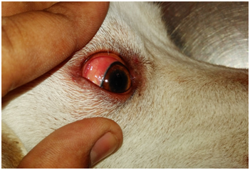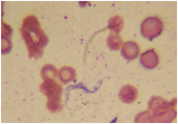 Two adult dogs were presented to the Hospital with a history of in-appetence, dullness, progressive emaciation, corneal opacity, congested mucus membranes, and persistent fever. Both the dogs were treated with antibiotics and antipyretics at local hospitals with partial relief of symptoms. Clinical examination of dogs revealed elevated rectal temperature, pulse rate, respiratory rate; pale and congested mucous membranes, corneal opacity, bilateral lacrimation and generalized debility (Figures 1& 2). Peripheral blood was collected and examined under light microscopy for haemoprotozonas which revealed the presence of motile trypanosomes. Microscopic examination of Giemsa stained blood smear revealed the presence of Trypanosoma evansi organisms in between the red blood cells (Figure 3). Further blood was collected for haematological and biochemical analysis.4 Dogs were treated with two doses of injection diminazene aceturate @3.5mg/kg body weight intra muscularly at 96 hours interval, inj. meloxicam @0.3mg/kg body weight sub cutaneous for first three days, five doses of inj. iron dextran (imferon) 10mg/kg body weight intra muscularly at 48 hours interval and oral supplementation of iron containing syrup (Dexorange) @10 gram per day daily. Post-treatment, the parasitemia was estimated by direct microscopic examination of blood and stained smears.