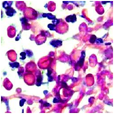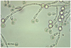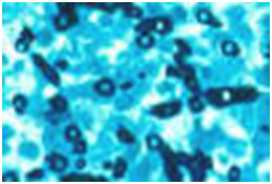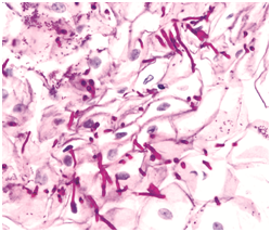 Molecular analysis of Candida employs a Real time Polymerase Chain Reaction (RT-PCR). Monoclonal antibodies besides the Rapid agglutination tests (RLA) may also be applicable. Debatable conditions such as a “Candida Leukoplakia” mandate an evaluation of a histological specimen.1,6 Imprint smears and tissue material may be analyzed with the Periodic acid Schiff’s (PAS) stain. The carbohydrates in the fungal cell wall stain magenta. Gram Positive reactivity on Gram’s stain may be elucidated by the micro-organism.1,2,5