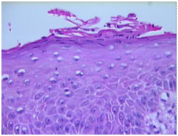 Histopathology: elucidates an epithelial entrenchment by the Candida hyphae and fungal spores accompanied with chronic inflammation, hyperkeratosis, parakeratosis and orthokeratosis.1,6 Hyperplasia with Candida inflammation generally elucidates a dysplastic metamorphosis.1,6