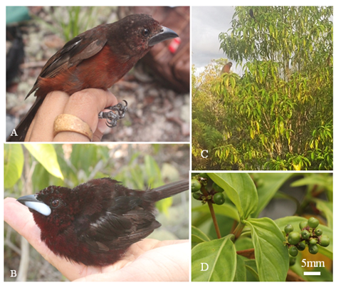 Communities of birds in white sand vegetation are characterized by low number of species when compared to terra firme forests, with high level of endemism,5–7 a distinctive species composition8 and with a number of species that regularly consume fruits. Seed dispersal is the process where seeds are taken to distances considered safe from the parent plant, where competition and predation may theoretically be smaller.9,10 In tropical forests, animal-mediated dispersal is very common11,12 and birds play a very important role among dispersing vertebrates because of their abundance, frequency of feeding on fruits, variety of seed sizes that they can ingest and by enabling long distance dispersal.13,14 In campinas and campinaranas, seed dispersal by birds may play an important role due to the patchy distribution of these habitats, but very little information exists to date about this process. Thus, in this note we report on consumers and possible dispersers of P. guianensis. The study area is located near Iranduba, ca. 10km from the Rio Negro bridge, that connects Manaus to other cities to the south-west, on the secondary road Lago do Janauari, Community Vale do Amanhecer (2º11’52.5”S, 60º07’02.8”W;) (Figure 1). The vegetation type is grassy-woody campina, surrounded by arboreous campinarana. The study site is located in a new urban expansion area with considerable recent landscape change. We obtained information on fruit consumers and possible dispersers of P. guianensis with focal observations and video records conducted in July 2015. A total of 32 hours of observation were done. Five 12-m mist-nets were operated close to the recording sites during one morning in April 2016 (6:00-11:00), captured birds were banded and released immediately. During our video or focal observations we recorded a single bird species, Rhamphocelus carbo (Pallas, 1764) (Ave: Thraupidade), silver-beaked Tanager, consuming fruits of P. guianensis. They foraged in groups of males and females for two to three minutes. With mist-nets we captured five R. carbo individuals (2 females and 3 males). During handling, we observed that they had consumed the whole fruits and seeds, as they defecated P. guianensis seeds intact (Figure 2). Ramphocelus carbo presents a marked sexual dimorphism. The female has a dark brown forehead and back, wings and a pure black tail; abdomen, flanks and rust-brown uropyge; the jaw is black.15 The male features are the purple head and chest, blackened wings and tail, the upper and black beak, and the lower beak is whitish in color. The species is usually found in small groups frequently with predominance of males and females and a few juveniles, they are omnivorous, foraging insects and fruits.16,17 This species is common in forest and shrubby habitats and is also frequent in human-modified landscapes.17 Males in the breeding season exhibit territoriality using an early morning chorus which means that their breeding ground goes up to a 10m radius.16