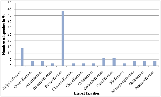 In this study, order Passeriformes was numerically the dominant order represented with 22 species from the 50 identified species which accounts 44% of the identified species. This result is in agreement with Desalgn & Subramanian4 in Angereb forest and adjacent farm land in Northwestern Ethiopia and Tesfahunegny et al.5 in Kafa biosphere reserve, Southwest Ethiopia. They reported among the 89 and 42 species identified respectively, 66.3% and 47.6% of the species are belonged to the order Passeriformes.
