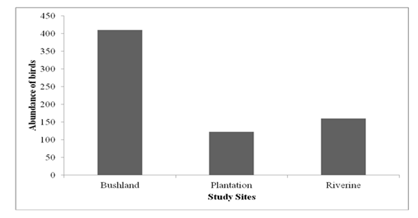 From the 50 species of birds identified during the study period, highest number; 36 species were recorded from bushland, and nearly similar number of species; 14 and 15 species were recorded from riverine forest and plantation area respectively. Twelve (24%) common species were recorded in bushland and plantation habitats, and 3 (6%) common species in bushland and riverine habitats (Table 3). Moreover, from the total 692 birds counted during the study period, 410 of them were recorded from bushland habitats, 122 and 160 birds from plantation and riverine forest habitats respectively. The total abundance of birds showed significant (ANOVA result, p = 0.00) variation among the three study sites. The highest bird abundance was recorded in bushland, while the lowest was in plantation area (Figure 3).