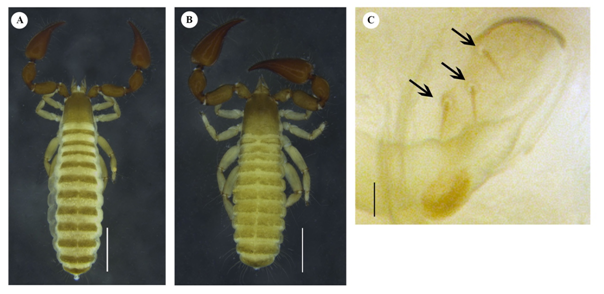 Pedipalps (Figure 3L–M): Trochanter and femur pale reddish-brown; patella and chela dark reddish; trochanter, femur, patella and chela finely granulated. Dorsal tubercle of trochanter well developed, with 3 setae at apex; trochanter 1.33 (m#), 1.63 (f#) x longer than broad. Femur 2.11 (m#), 2.0 (f#) x longer than broad; 3 pseudotactile setae. Patella 1.81 (m#), 1.90 (f#) x longer than broad, with stout pedicel; 2 pseudotactile setae at base. Chela 2.62 (m#), 2.43 (f#) x longer than broad; fixed finger with 32 (m#f#) teeth, movable finger with 46(m#), 49 (f#) teeth. Nodus ramosus not extending to et (Figure 3L). Trichobothrial pattern (Figure 3L): t distal to middle of movable finger; one pseudotactile seta present laterally near tip of finger; one pseudotactile seta laterally between t and st; st closer to sb than to t; sb closer to b than to st; et near to the tip of fixed finger, est distal to the middle, et, est, esb, eb near to the inner margin; it farther from the fingertip, it, ist, isb, ib far away from inner margin; three sense spots present above esb, four sense spots between ist and ib. Palm with short dentate setae, 5 tactile setae near base.