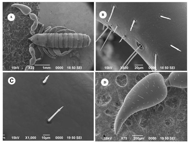Pedipalps: Trochanter 0.255/0.254 (0.379–0.391/0.284–0.295), trochanter pedicel 0.088/0.160 (0.084–0.089/0.144–0.154), femur 0.632/0.328 (0.580–0.687/0.325), femur pedicel 0.067/0.137 (0.065–0.093/0.140–0.150), patella 0.566/0.400 (0.674–0.697/0.371–0.378), patella pedicel 0.114/0.174 (0.099–0.110/0.147–0.152), chela (with pedicel) 1.249/0.544 (1.296–1.319/0.503–0.520), chela (without pedicel) 1.179/0.544 (1.240–1.274/0.503–0.520), hand 0.716 (0.686–0.769), movable finger 0.532 (0.545–0.577). Leg I: femur 0.180/0.169 (0.213–0.216/0.172–0.203), patella 0.396–0.198 (0.370–0.444/0.193–0.202), tibia 0.346/ 0.135 (0.372–0.380/0.145–0.149), tarsus 0.292/0.103 (0.304–0.311/0.110). Leg IV: femur + patella 0.738/0.317 (0.674–0.823/0.285–0.300), tibia 0.549/0.199 (0.518–0.530/0.190–0.198), tarsus 0.338/0.119 (0.332–0.348/0.112–0.124).