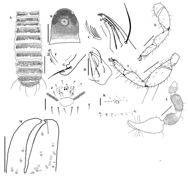 Opisthosoma: Width constant from tergite 1 to 11. Tergites 2–5 undivided; tergites 1 and 6–11 partially divided. Sternites with faint medial suture, with small dentate and moderately long, simple sternal setae. Anterior spiracle with 2 (m#), 3 (f#) setae, posterior spiracle with 1 (m# & f#) seta. Tergal chaetotaxy: m#, 9:10:10:13:16:14:16:15:14:14 (including 4 tactile setae):13 (including 2 tactile setae): 2, f#, 12:12:11:13:16:15:17:15:15:17 (including 4 tactile setae):14 (including 2 tactile setae):2. Sternal chaetotaxy: m#, 13:11:13:19:17:21:14:16:16 (including 4 tactile setae):15 (including 4 tactile setae):2, f#, 28:12:17:17:17:17:17:16:14 (including 4 tactile setae):14 (including 4 tactile setae):2.