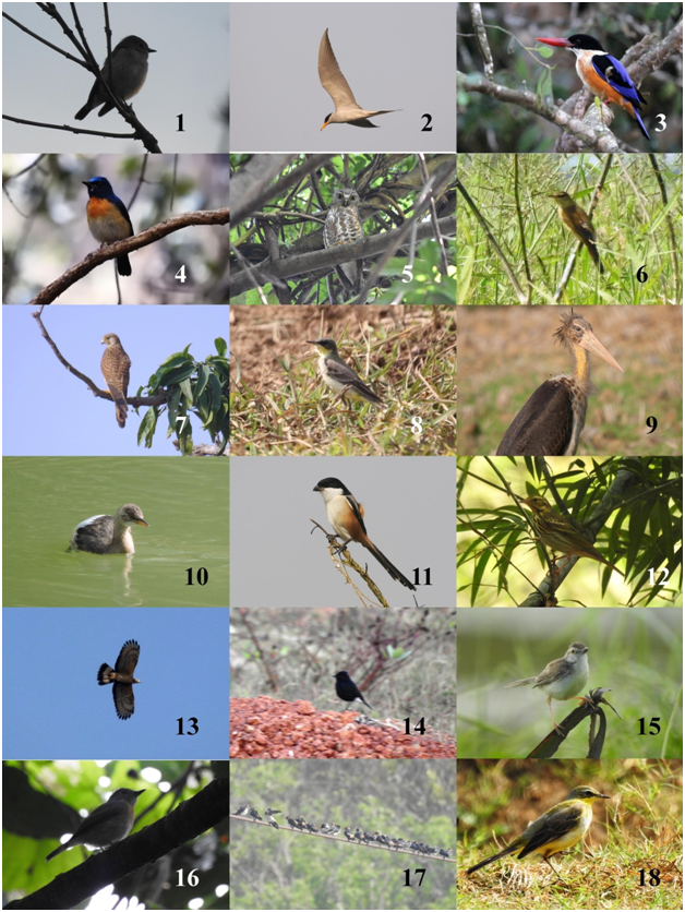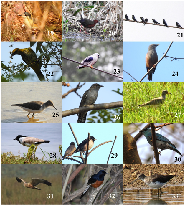 Figure 2 Photographs of some species sighted (1-Asian brown flycatcher, 2-River tern, 3-Black capped kingfisher, 4-Blue throated blue flycatcher, 5-Brown hawk owl, 6-Clamorous reed warbler, 7-Common kristel, 8-Grey wagtail, 9-Lesser adjutant, 10-Lettle grebe, 11-Long tailed shrike, 12-Olive backed pipit, 13-Oriental honey buzzard, 14-Pied bushchat, 15-Plain prinia, 16-Red breasted flycatcher, 17- Red-rumped swallow, 18- Yellow-footed green pigeon, 19-Small minivet, 20-Baillon's crake, 21- Wire tailed swallow, 22-Black naped oriole, 23-Black winged kite, 24-Chestnut tailed starling, 25-Common sandpiper, 26-Grey bellied cuckoo, 27-Grey headed lapwing, 28-River lapwing, 29-Rosy starling, 30-Verdicter flycatcher, 31-Western marsh harrier, 32-White rumped shama, 33-Wood sandpiper, 34- Orange-breasted green pigeon, 35-Fulvous-breasted woodpecker, 36- Blue rock thrush).