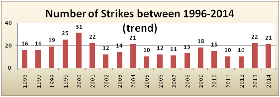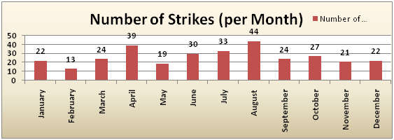 The Civil Aviation Organisation of Iran registered 318 bird strikes within the last 19 years in 31 airports. The number of registered bird strikes 1 to 64 in reported airports (Figure 1). The number of registered bird strikes varies from 10 up to 31 in various year (Figure 2), i.e. this means a ratio of 16/74 strikes per year and ratio of between 0.33 and 0.78 per 10,000 movements. The distribution of strikes over the year shows peaks in spring and August (Figure 3).