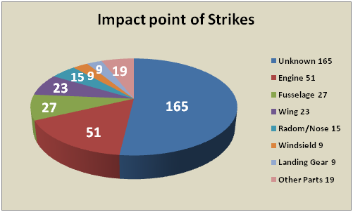 Furthermore, not much information is available on the impact point; 52% is unknown. From those of identified points, 33% are belong to engines, Fuselage 18%, Wing 15%, Radom & nose 10%, Windshield 6%, Landing Gear 6% and other parts 13% (Figure 5).