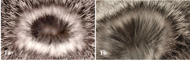 The intermediate color is a color layer or ring located between the undercolor and the Topcolor. In many cases, the undercolor was lighter at the base with a faint or blurred intercolor. In the Chinchilla Giganta, the intermediate color was often greyish and faint. According to Covriget al.12 and Neirurerova et al.10 the important part of the Chinchillas coat coloring is the white intermediate color, which creates a ring typical of the breed (Figure 7).