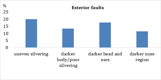Supuka et al.2 stipulated that the guard-hair coloring of BLS should create an overall silky, milky impression. Silverness should have as much uniformity on the head, torso and limbs as possible. Among the most common deviations from the standard color in BLS which we found in our work was irregular distribution of silver coloring (20.0%), manifested mainly by darker head and ears (17.5%) or a darker butterfly on the face (11.4%) (Figure 6 & Graph 1).