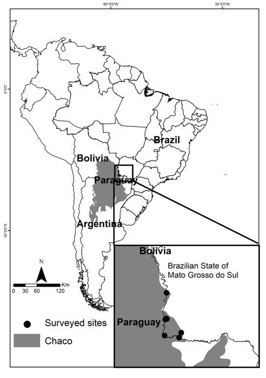 We are thankful to the Prefeitura Municipal de Porto Murtinho, to the Brazilian Army-2ª Cia Fronteira, and to Fabio Santos for all the support received during the field work, especially during the activities 2008-2015. Flavia Batista helped to elaborate the map.