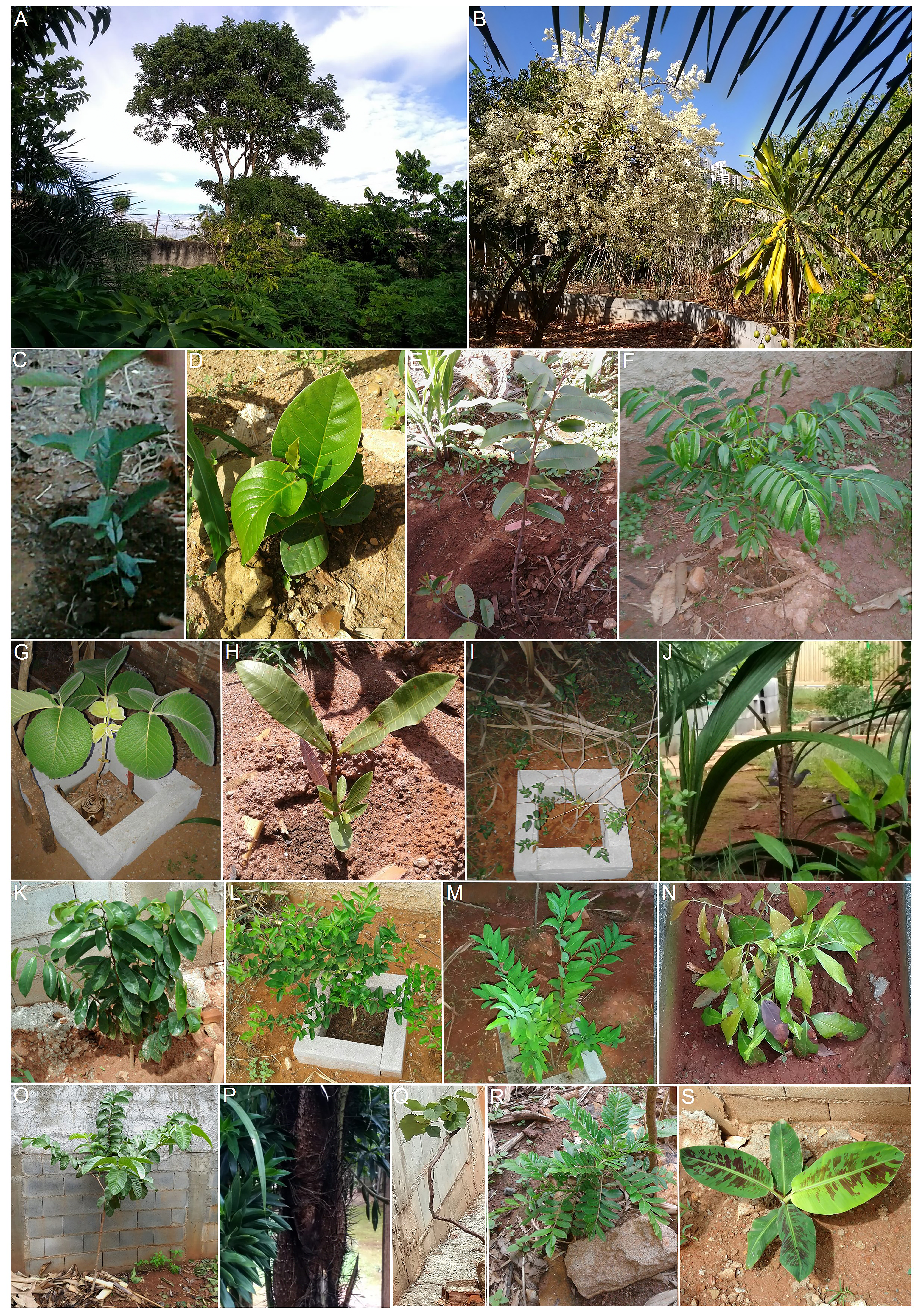 Figure 1 Tree species remaining from the Cerrado biome and planting of fruit trees in a small reforested urban space near downtown Goiânia, Goiás state, Brazil. English common name follows the Portuguese common name. (A) Cambará (Gochnatia polymorpha). (B) Cagaiteira, cagaita (Stenocalyx dysentericus). (C) Muricizeiro, nance (Byrsonima crassifolia). (D) Araticunzeiro, marolo (Annona crassiflora). (E) Mangabeira, mangaba rubber tree (Hancornia speciosa). (F) Cajá-anão, ambarella (Spondias dulcis; dwarf variety). (G) Pequizeiro, pequi (Caryocar brasiliense, dwarf variety). (H) Cajueiro, cashew (Anacardium occidentale). (I) Jaboticabeira, Brazilian grape (Plinia cauliflora). (J) Guarirobeira, guariroba (Syagrus oleracea). (K) Gravioleira, soursop (Annona muricata). (L) Limoeiro Galego, Galician lemon (Citrus aurantifolia). (M) Ata, sugar apple (Annona squamosa). (N) Lichia, lychee (Litchi chinensis). (O) Goiabeira, guava (Psidium guajava). (P) Macaubeira, grugru (Acrocomia aculeata). (Q) Videira, grape (Vitis labrusca). (R) Seriguela, purple mombin (Spondias purpurea). (S) Bananeira, banana (Musa sp.)