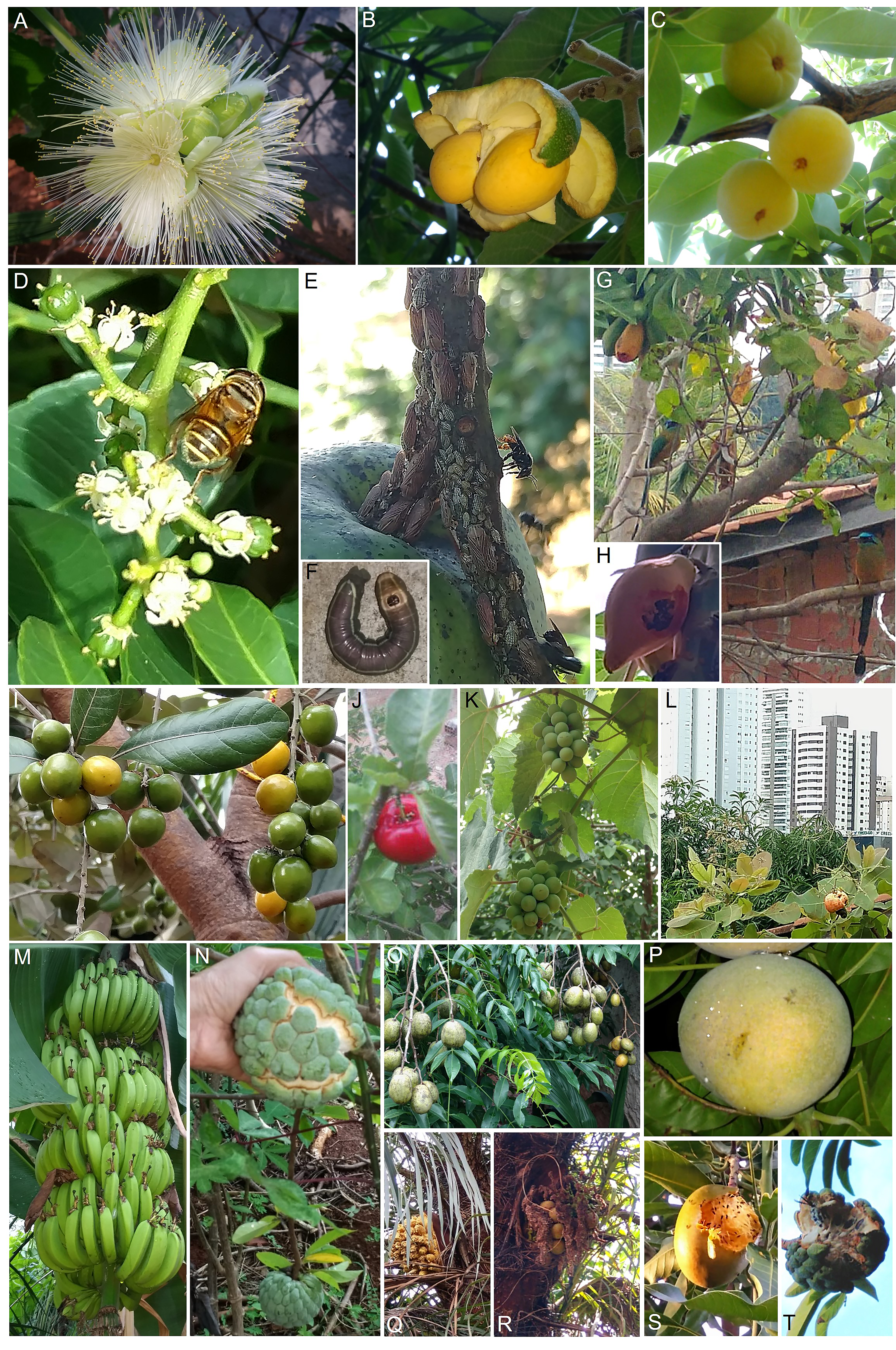 Figure 2 The food resources available for birds and insects and plant-animal interactions in a small reforested urban space near downtown Goiânia, Goiás state, Brazil Observations came from a study conducted between June 2020 and May 2021, during the covid-19 pandemic. (A) Pequizeiro flower. (B) Pequi fruit (Caryocar spp). (C) Cagaitas (Stenocalyx dysentericus). (D) A hoverfly (Syrphidae) pollinating ambarella (Spondias dulcis) flowers. (E) Nymphs and adults of leafhoppers (Aethalion reticulatum) sucking phloem sap from twigs of mango (Mangifera indica) and arapuás or dog-bees (Trigona spinipes) licking the honeydew produced by leafhoppers. (F) Caterpillar. (G) Papaya with fruit partially eaten by an Amazonian Motmot pair, which rests on a manioc branch and cashew near its nest. (H) Papaya fruit consumed by birds. (I) Fruits of the Muricizeiro or nance (Byrsonima crassifolia). (J) Acerola cherry (Malpighia emarginata). (K) Grape (Vitis labrusca). (L) Cashew (Anacardium occidentale) fruit. (M) Banana (Musa sp.) bunch. (N) Ata or sugar apple (Annona squamosa) fruit. (O) Cajá-anão, ambarella (Spondias dulcis) fruit. (P) Sabina mango (Mangifera indica) fruit. (Q) Macaubeira (Acrocomia aculeata) with flowering bunch, and later, (R) with coconuts (S). (T) Mango and ata fruit consumed by birds.