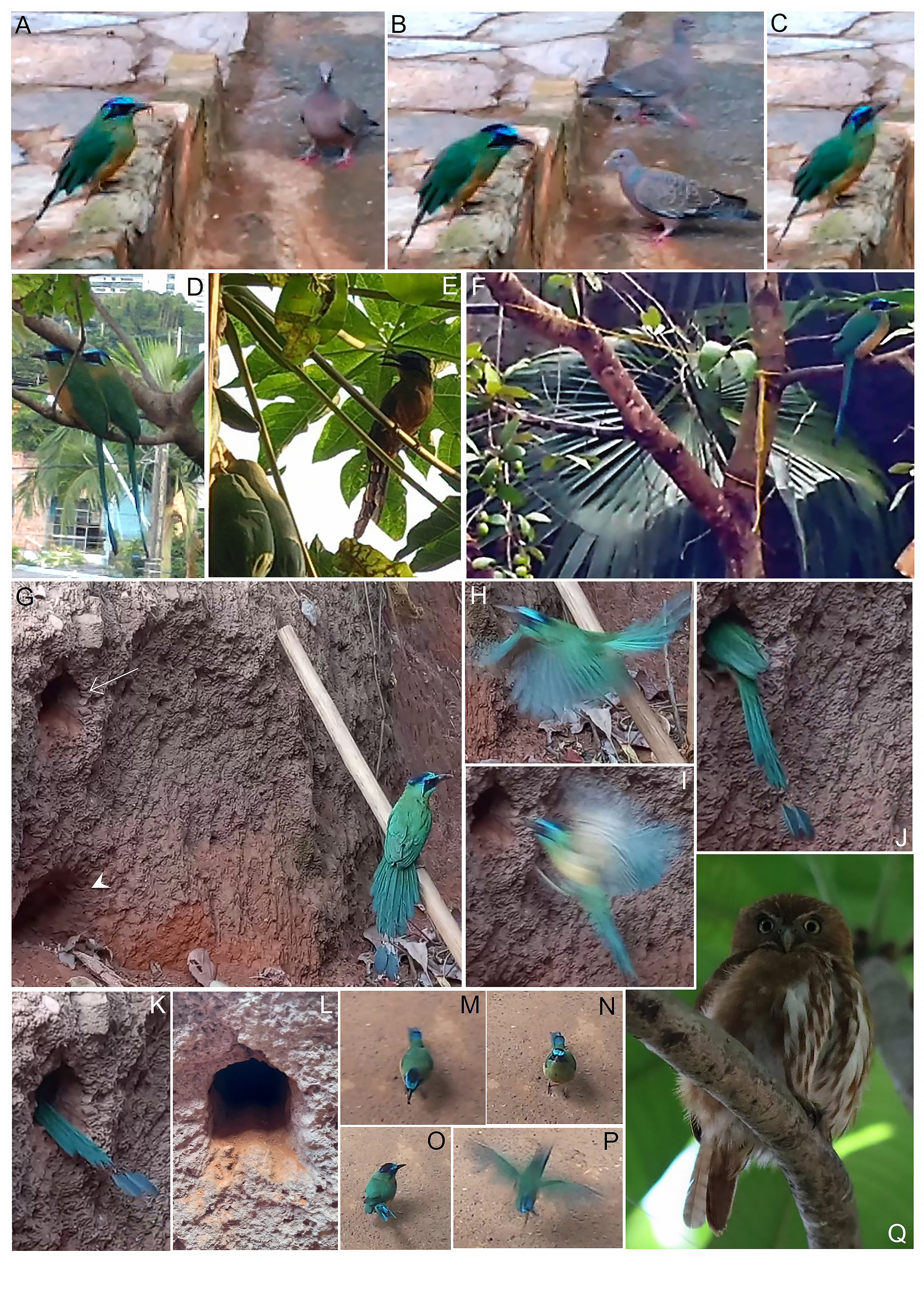 Figure 3 The activity of Amazonian Motmots (Momotus momota) during 2020-2022 in a small reforested urban space near downtown Goiânia, Goiás state, Brazil. (l) Photographic records taken between June 2020 and September 2021, during the covid-19 pandemic. (A-C) An Amazonian Motmot eats an earthworm next to two Picazuro Pigeons (Patagioenas picazuro). (D) An Amazonian Motmot pair rests in the cashew treetop over their nest. (E-F) Adult individuals rest on branches of papaya (Carica papaya) and murici (Byrsonima crassifolia), respectively. (G) An adult individual perched on a hoe handle in front of the entrance of its nest (arrow), excavated in an artificial ravine (Finding date: 25 September 2021). Under the nest entrance, dogs dug a hole, attempting unsuccessfully to prey upon adults or nestlings (arrowhead). (H)- (K) An Amazonian Motmot enters its nest. (L) Tunnel entrance leading to the nest. The nest was in an underground chamber at the bottom of the tunnel both pair members excavate the tunnel. (M-P) A young Amazonian motmot calmly lands on the floor in front of the entrance of a residence, eats a small insect and flies close to the ground, showing tolerant to humans. (Q) A Ferruginous Pygmy-Owl (Glaucidium brasilianum) perched on a tree branch.