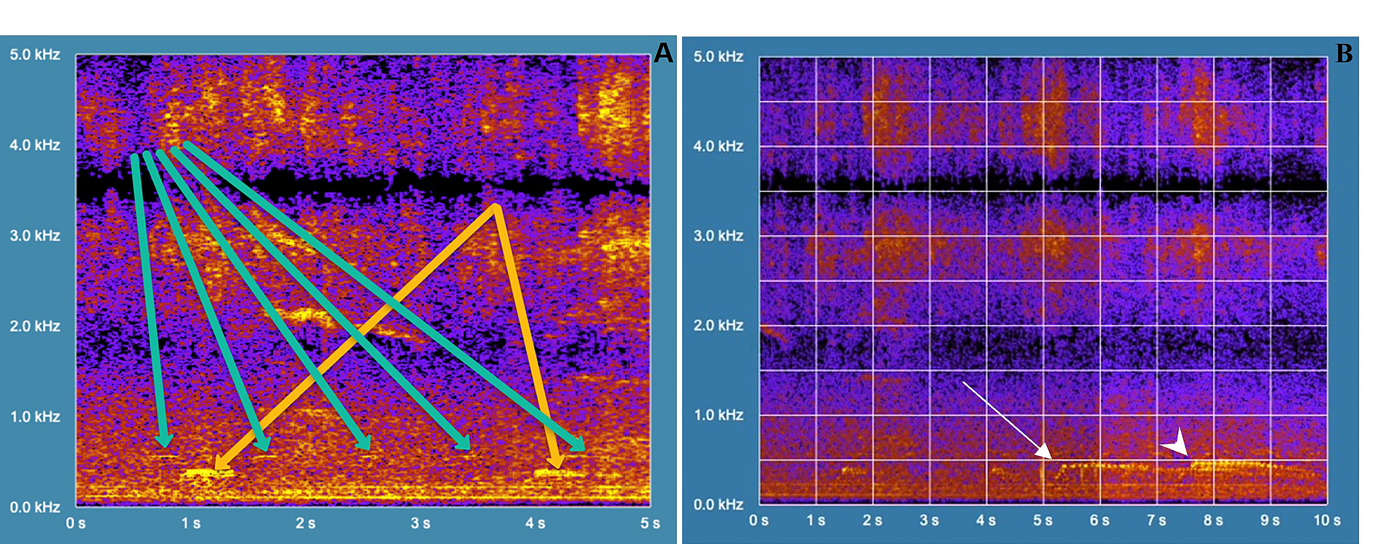 Figure 5 Spectrogram of sound emissions from Amazonian Motmot (Momotus momota) and other bird species present in a small urban reforested space near downtown Goiânia, Goiás state, Brazil. (A)Vocalizations of Yellow-chevroned Parakeet (green arrows) and Amazonian Motmot (yellow arrow). (B) Starting two distinct sound frequencies heard, which overlap (arrow and arrowhead), a duet call emitted by Amazonian Motmots.