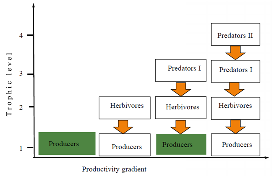 Figure 2 Fretwell-Oksanen Exploitation Ecosystem Hypothesis (EEH) as a function of productivity gradient model. The model suggested that varying productivity, herbivory, and predation make habitats green in systems with one or three trophic levels, but barren in systems with two or four levels adapted from.6