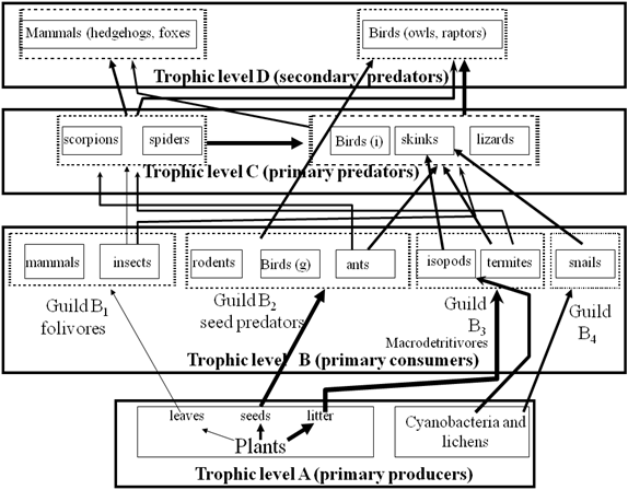 Figure 4 An example of community structure and various trophic level interactions among the biotic communities in the desert ecosystem. Species within a guild are expected to compete on resources, whereas species within a trophic group are expected to suffer from apparent competition.27