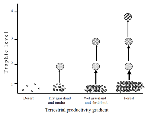 In desert ecosystem, herbivores and their associated predators are mostly small in their body size. For example, many herbivores are small mammals, birds, insects, and other small arthropods.13,17,27,50 Moreover, biotic communities are less complex. And food webs are mostly less complex relatively in the form of long food chains. For example, Menge and Sutherland8 noted that food web complexity decreases with increasing environmental stress. Most of the trophic levels in the desert ecosystem are based on the litters and detritivores. For example, Ayal13 noted that due to the scarcity of water resource in the desert ecosystem, micro detritivores mostly live as symbiotic inside the digestive systems of other macro-detritivores and facilitate digestion of hard dead plant materials for common benefits. However, there is a high diversity of predators and primary consumers in the desert ecosystem27 see also Figure 4. Ayal13 also suggested that predators are not efficient either because productivity is too low to support a predator trophic level or sufficiently high to allow predators of predators to limit them. As a result, compared to both the tropical rain forest and the grassland ecosystems, the influence of abiotic factors in controlling and shaping the structure and size of biological communities is the strongest in the desert ecosystem due to the energy limitation hypothesis.6,14,15,16 The Fretwell-Oksanen model also predicts an increase in the number of trophic levels with the increase in productivity gradient (i.e., the ELH) Figure 7. However, in a recent theoretical study, it was hypothesized that the combination of productivity and organism size is crucial to determine the potential of the number of trophic levels in the terrestrial ecosystems.17 Unlike previous arguments made on the number of tropic levels in the desert ecosystem i.e., due to the ELH; e.g.,6,14–16,51 Ayal17 argued that in the desert ecosystem, the potential number of trophic levels can reach up to five links, suggesting that vertical and horizontal interactions should be combined to determine the distribution of biomass in terrestrial ecosystem see Figure 8. This implies that future empirical studies are crucial to test the recent hypothesis proposed by Ayal.17