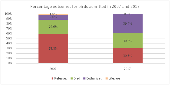 Figure 1 Bar chart depicting the differences in percentage outcome of birds admitted in 2007 versus 2017.