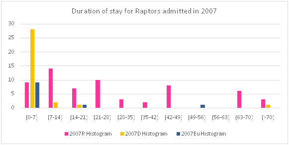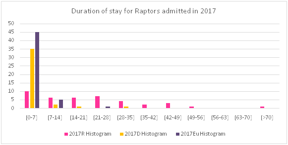 The mean duration of stay in 2007 and 2017 differed for each category of bird and between the years (Figure 2&3). Mean stay in days for 2007: released birds = 26, dead birds = 6, euthanized = 8. Mean stay in days for 2017: released birds = 20, dead = 2, euthanized = 2.