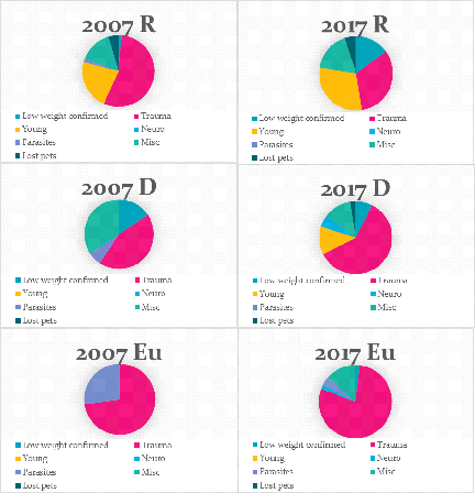 Figure 4 shows the major reasons for admission versus their outcomes in 2007 and 2017. The majority of birds overall in both years were admitted due to trauma (mostly road traffic collisions). This would comply with findings by Molina-Lopez6 and Fix and Barrows7 who showed that the majority of incoming cases are trauma-based. A higher percentage of 2007 released birds were admitted due to trauma compare to 2017 released birds (37 birds in 2007 and 13 birds in 2017). The majority of euthanized birds for both years were trauma cases. Linking the results from Figure 1&4 suggests that more of the incoming trauma cases are euthanized in 2017 compared to 2007. Additionally, no statistically significant difference could be found between the total numbers of trauma cases in both 2007 and 2017 (p = 0.59). This means that the changes in the proportions of euthanized and released birds between these years are likely to be due to more trauma birds picked as cases for euthanasia rather than rehabilitation. Reasons for this could be increased severity of trauma cases in recent years or lower injury thresholds for euthanasia candidates, as suggested above, due to their documented lower success-rates in papers such as that of Punch.8 The trauma category used in this study is too broad to elucidate the answer here, however splitting of the categories and assessing for severity of conditions in the future could answer these questions.